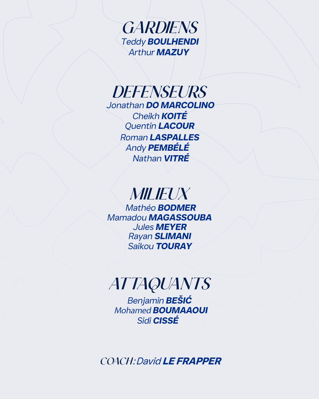 Découvrez le groupe sélectionné par David le Frapper pour cette 31ème journée de championnat et le déplacement à Auguste Bonal face au Football Club Sochaux Montbéliard.