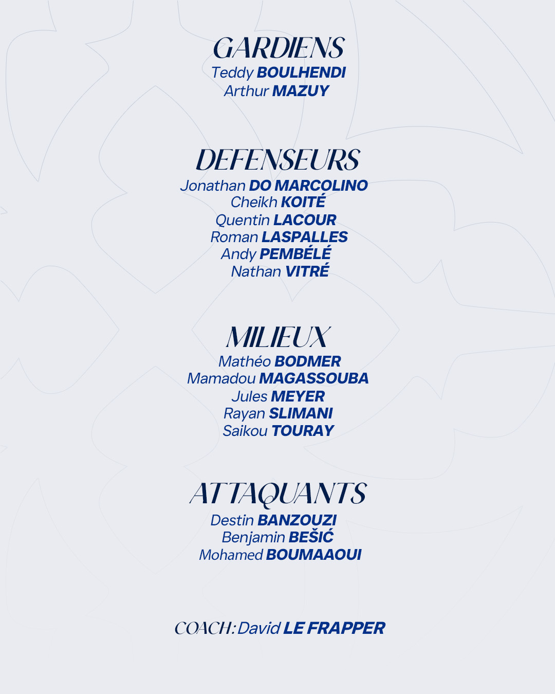 Découvrez le groupe sélectionné par David le Frapper pour cette 30ème journée de championnat et la réception du Stade Malherbe de Caen.