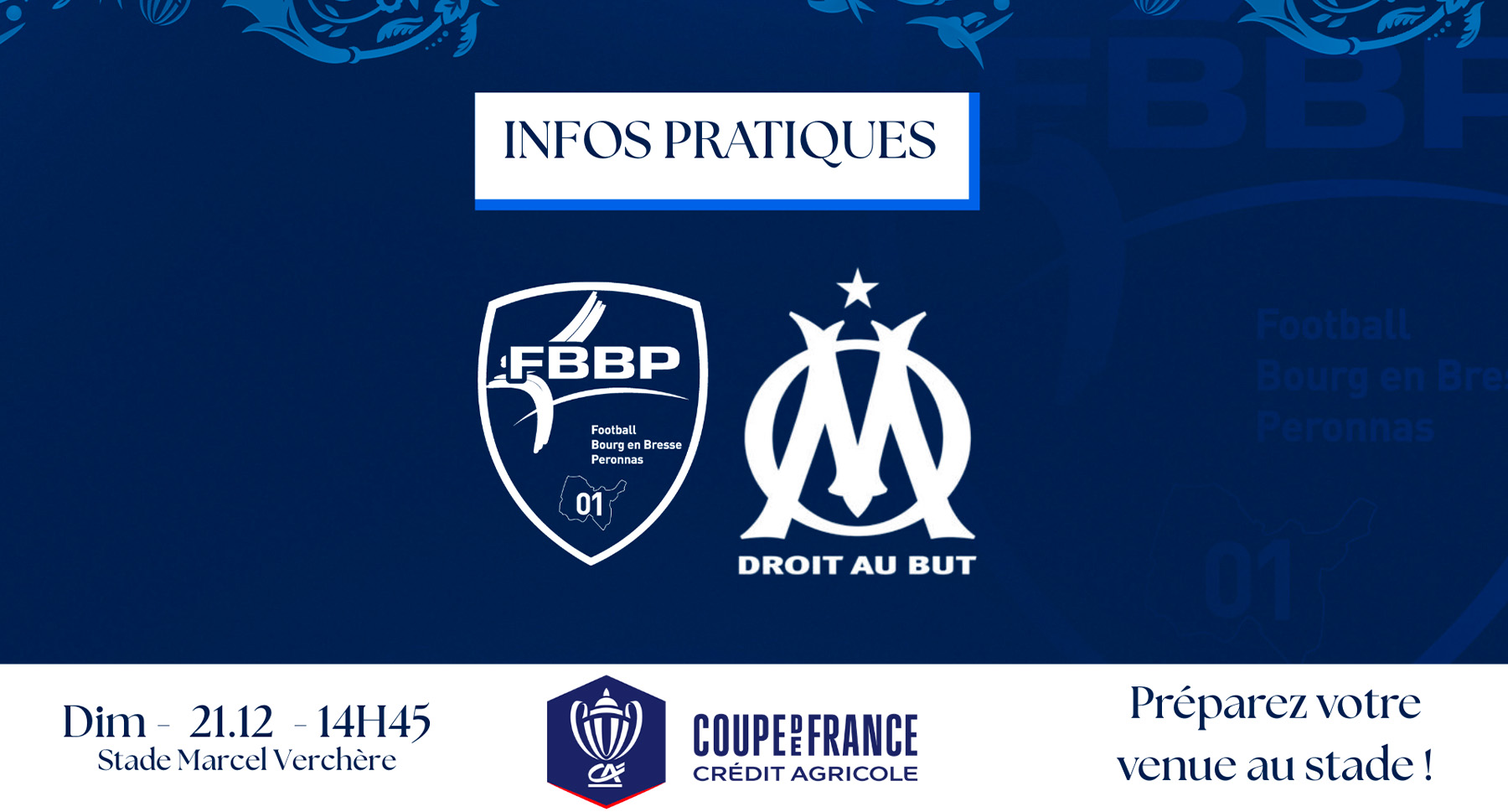 Venez vivre un rendez-vous historique entre le FBBP01 et l’Olympique de Marseille en 32es de finale de la Coupe de France Crédit Agricole, au Stade Marcel-Verchère ce dimanche 21 décembre à 14h45.